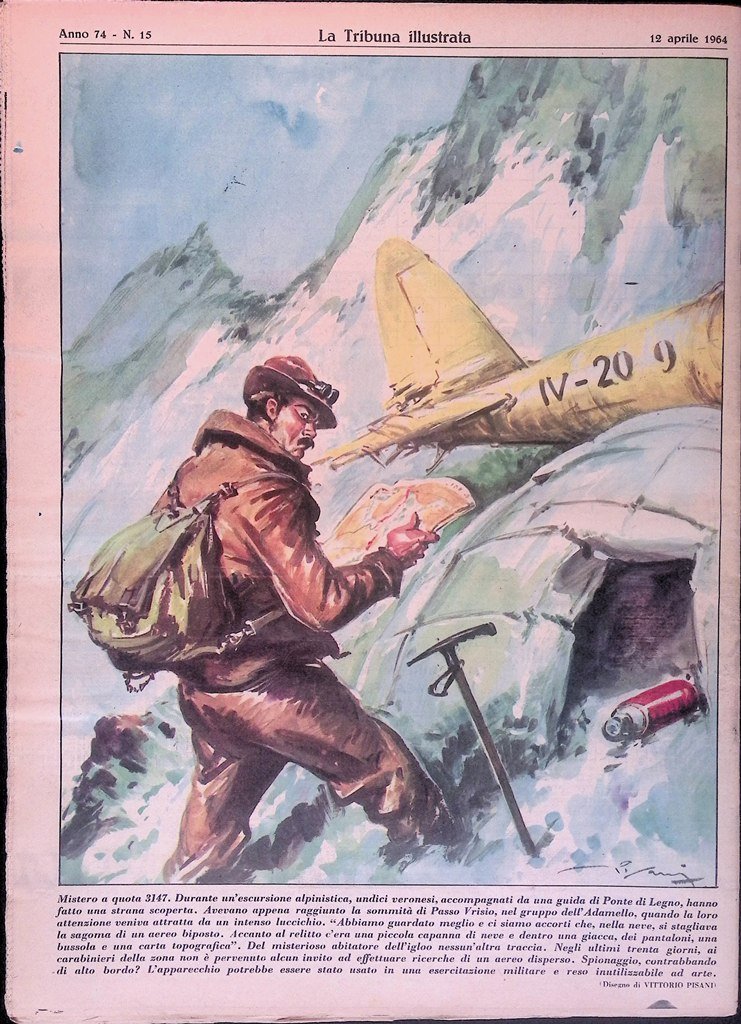 Mistero a quota 3147. Durante un'escursione alpinistica, undici veronesi, accompagnati da una guida di Ponte di Legno, hanno fatto una strana scoperta. Avevano appena raggiunto la sommità di Passo Vrisio, nel gruppo dell'Adamello, quando la loro attenzione veniva attratta da un intenso luccichio. "Abbiamo guardato meglio e ci siamo accorti che, nella neve, si stagliava la sagoma di un aereo biposto. Accanto al relitto c'era una piccola capanna di neve e dentro una giacca, dei pantaloni, una bussola e una carta topografica". Del misterioso abitatore dell'igloo nessun'altra traccia. Negli ultimi trenta giorni, ai carabinieri della zona non è pervenuto alcun invito ad effettuare ricerche di un aereo disperso. Spionaggio, contrabbando di alto bordo? L'apparecchio potrebbe essere stato usato in una esercitazione militare e reso inutilizzabile ad arte.