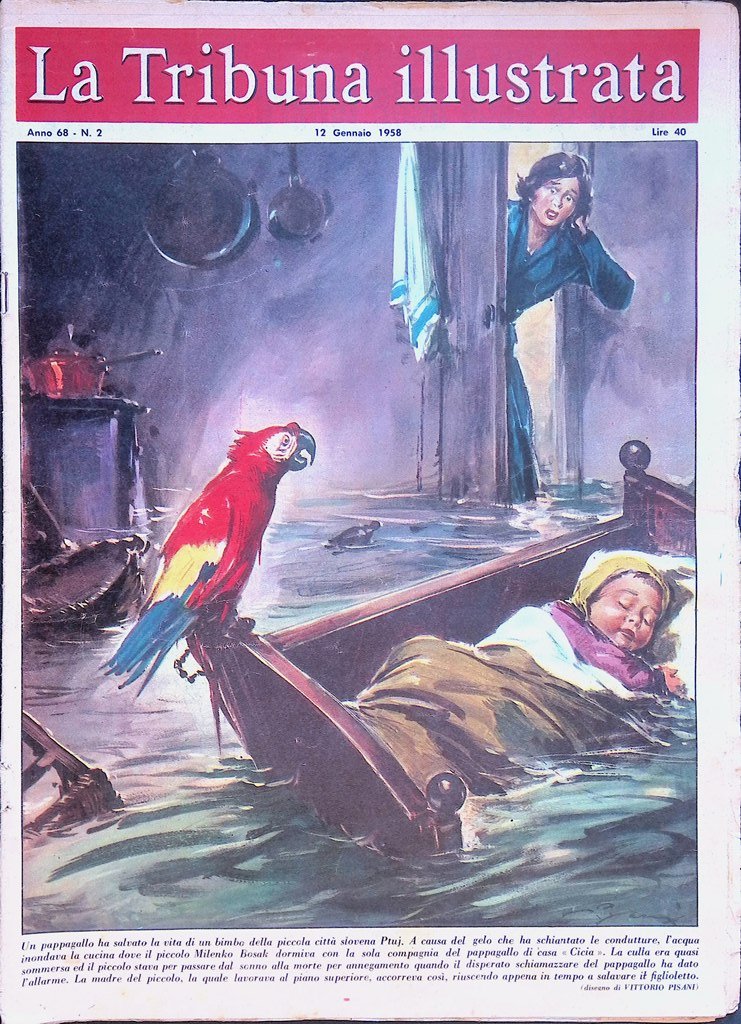 Un pappagallo ha salvato la vita di un bimbo della piccola città slovena Ptuj. A causa del gelo che ha schiantato le condutture, l'acqua inondava la cucina dove il piccolo Milenko Bosak dormiva con la sola compagnia del pappagallo di casa « Cicia ». La culla era quasi sommersa ed il piccolo stava per passare dal sonno alla morte per annegamento quando il disperato schiamazzare del pappagallo ha dato l'allarme. La madre del piccolo, la quale lavorava al piano superiore, accorreva così, riuscendo appena in tempo a salvare it figlioletto.