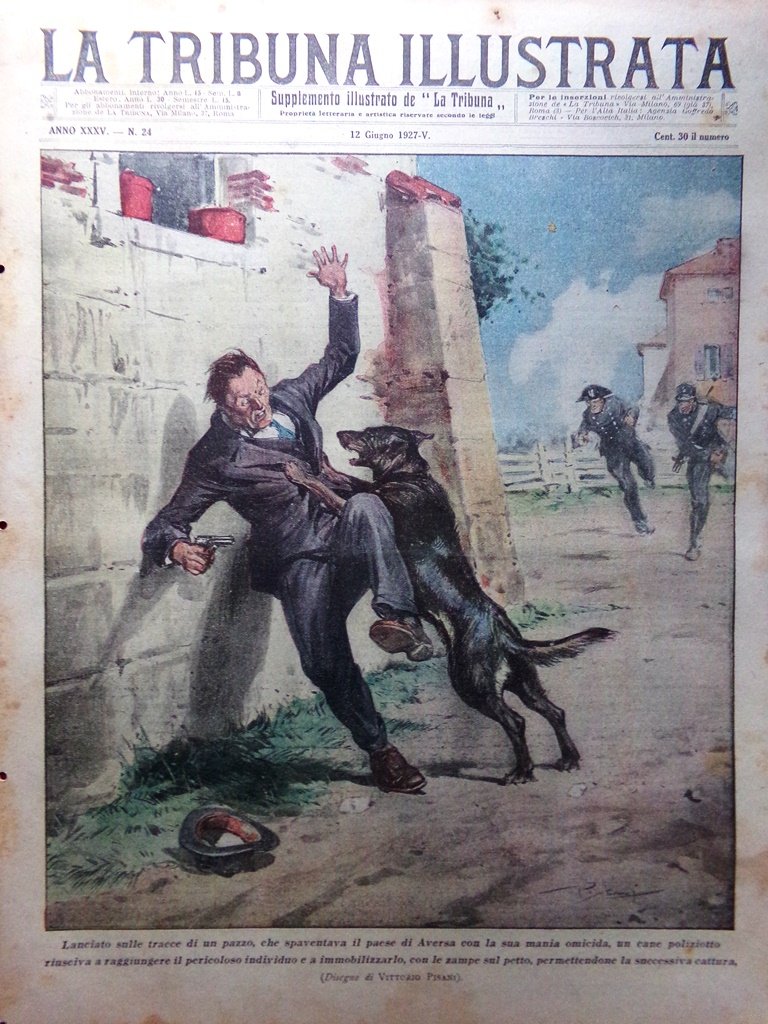 Lanciato sulle tracce di un pazzo, che spaventava il paese di Aversa con la sua mania omicida, un cane poliziotto riusciva a raggiungerlo e immobilizzarlo (disegno di Vittorio Pisani)