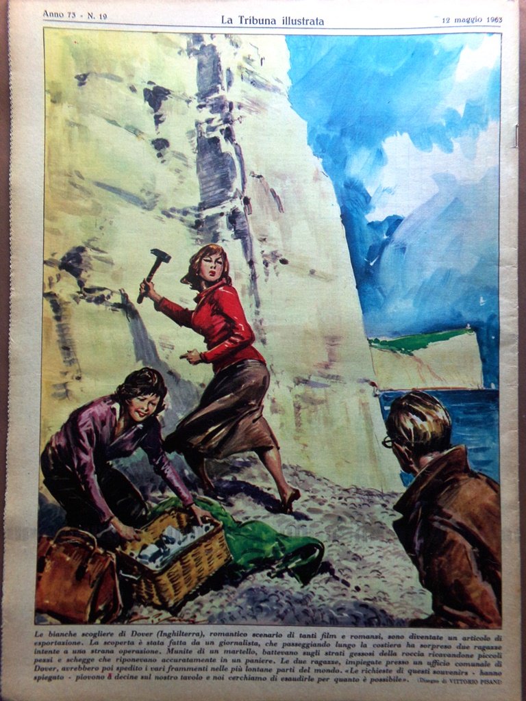 Le bianche scogliere di Dover (Inghilterra), romantico scenario di tanti film e romanzi, sono diventate un articolo di esportazione. La scoperta è stata fatta da un giornalista, che passeggiando lungo la costiera ha sorpreso due ragazze intente a una strana operazione. Munite di un martello, battevano sugli strati gessosi della roccia ricavandone piccoli pezzi e schegge che riponevano accuratamente in un paniere. Le due ragazze, impiegate presso un ufficio comunale di Dover, avrebbero poi spedito i vari frammenti nelle più lontane parti del mondo. "Le richieste di questi souvenirs", hanno spiegato, piovono a decine sul nostro tavolo e noi cerchiamo di esaudirle per quanto è possibile (disegno di Vittorio Pisani)