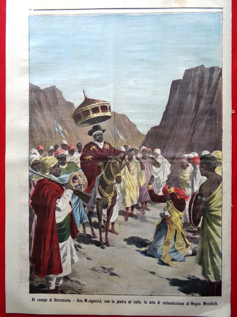 Al campo di Borumieda: Ras Mangascià, con la pietra al collo, fa atto di sottomissione al Negus Menelik