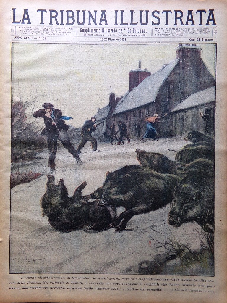 In seguito all'abbassamento di temperatura numerosi cinghiali sono apparsi in alcune località abitate della Francia. Nel villaggio di Leutilly è avvenuta una vera invasione (disegno di Vittorio Pisani)