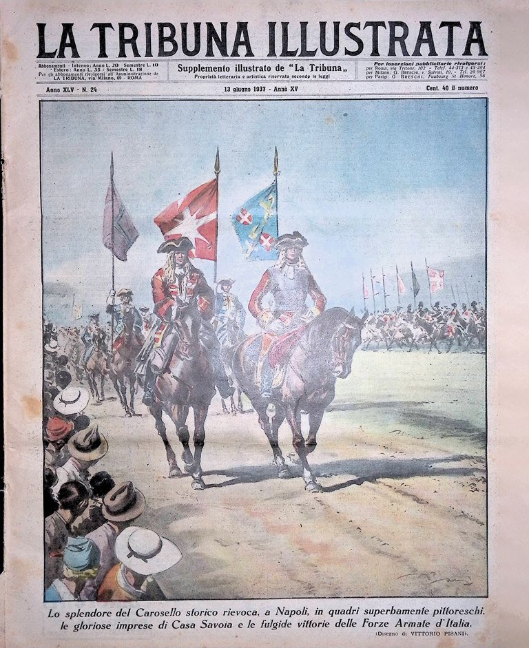 Lo splendore del Carosello storico rievoca, a Napoli, in quadri superbamente pittoreschi, le gloriose imprese di Casa Savoia e le fulgide vittorie delle forze armate d'Italia (disegno di Vittorio Pisani)