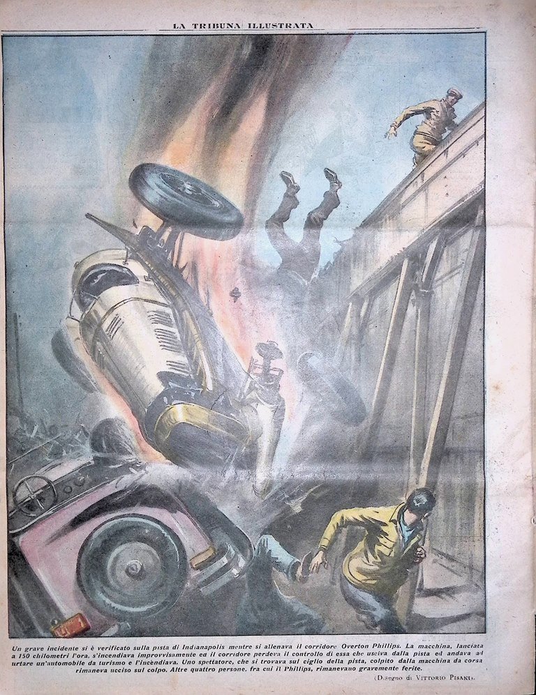 Un grave incidente si è verificato sulla pista di Indianapolis mentre si allenava il corridore Overton Phillips. La macchina, lanciata a 150 chilometri l'ora, si incendiava improvvisamente ed il corridore perdeva il controllo di essa che usciva dalla pista ed andava ad urtare un'automobile da turismo e l'incendiava. Uno spettatore, che si trovava sul ciglio della pista, colpito dalla macchina da corsa rimaneva ucciso sul colpo. Altre quattro persone, fra cui il Phillips restavano gravemente ferite (disegno di Vittorio Pisani)