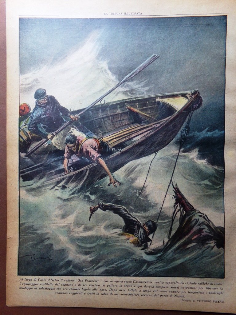 Al largo di Porto d'Ischia il veliero "San Francesco" che navigava verso Casamicciola, veniva capovolto da violente raffiche di vento. L'equipaggio, costituito dal capitano e da tre marinai si gettava in acqua e qui doveva compiere sforzi sovrumani per liberare la scialuppa di salvataggio che era rimasta legata alla nave. Dopo aver lottato a lungo col mare sempre più tempestoso i naufraghi venivano raggiunti e tratti in salvo da un rimorchiatore accorso dal porto di Napoli (disegno di Vittorio Pisani)