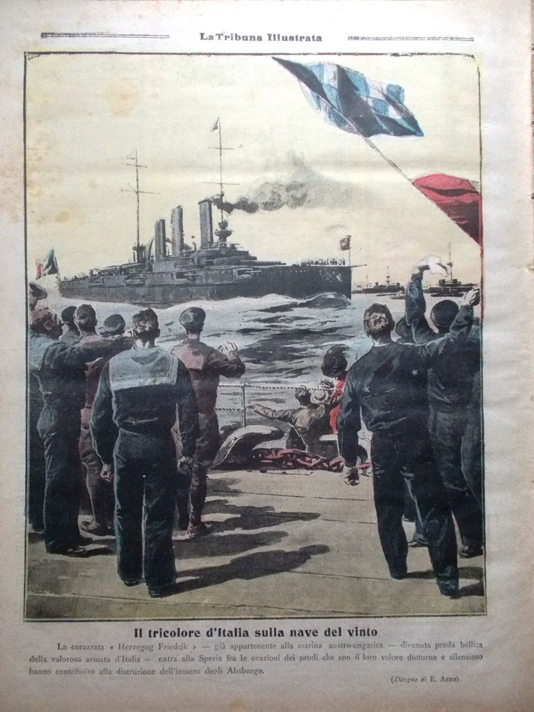 Il tricolore d'Italia sulla nave del vinto: la corazzata Herzegog Friedrik, divenuta preda bellica dell'Italia (disegno di E. Abbo)