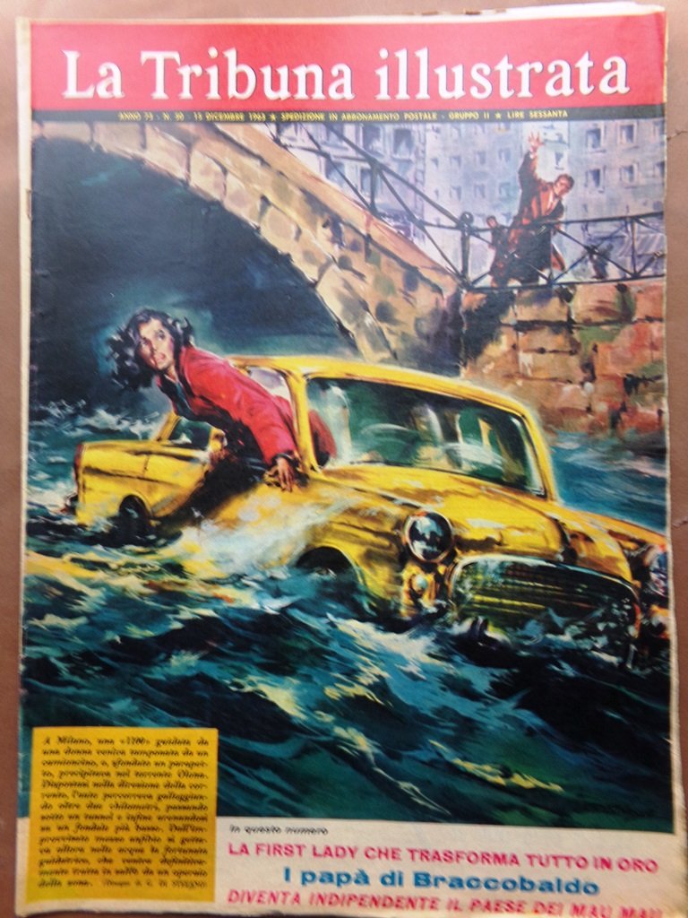 A Milano, una «1100» guidata da una donna veniva tamponata da un camioncino, e, sfondato un parapetto, precipitava nel torrente Olona. Dispostosi nella direzione della corrente, l'auto percorreva galleggiando oltre due chilometri, passando sotto un tunnel e infine arenandosi su un fondale più basso. Dall'improvvisato mezzo anfibio si gettava allora nelle acque la fortunata guidatrice, che veniva definitivamente tratta in salvo da un operaio della zona. (disegno di G. Di Stefano)