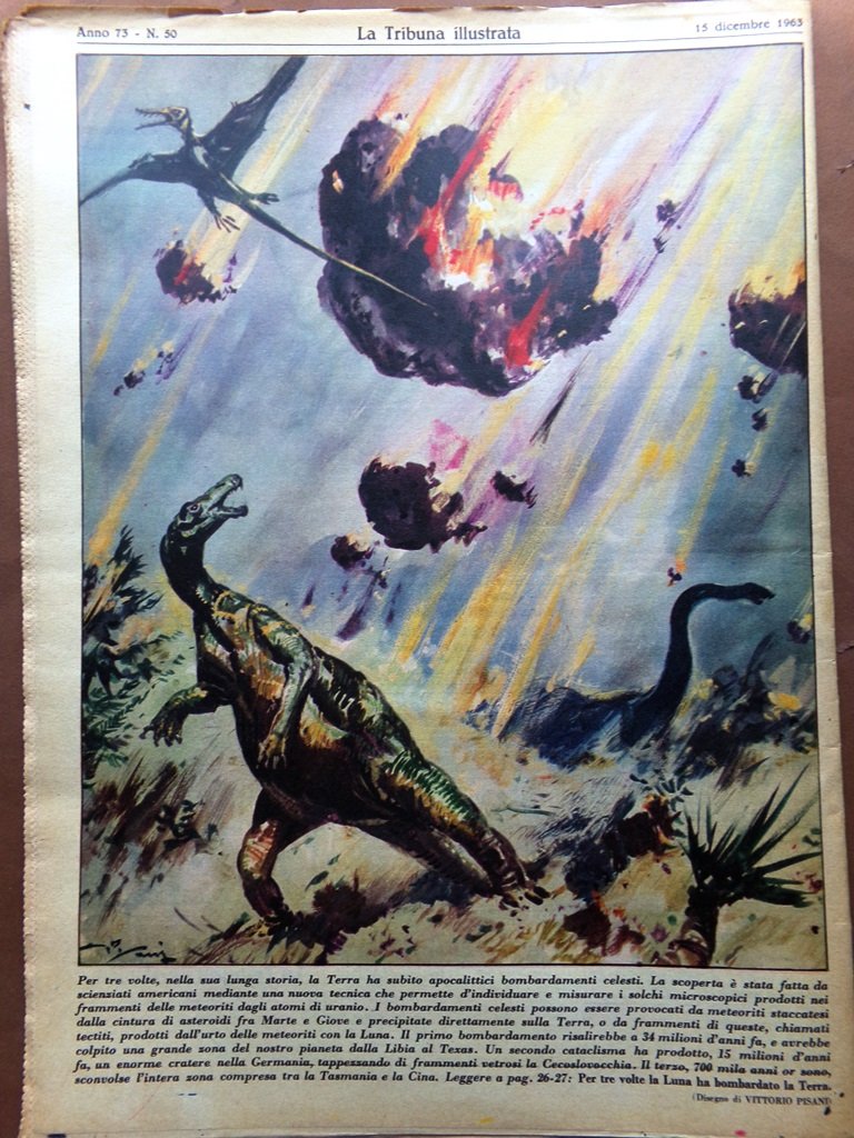 Per tre volte, nella sua lunga storia, la Terra ha subito apocalittici bombardamenti celesti. La scoperta è stata fatta da scienziati americani mediante una nuova tecnica che permette d'individuare e misurare i solchi microscopici prodotti nei frammenti delle meteoriti dagli atomi di uranio. I bombardamenti celesti possono essere provocati da meteoriti staccatesi dalla cintura di asteroidi fra Marte e Giove e precipitate direttamente sulla Terra, o da frammenti di queste, chiamati tectiti, prodotti dall'urto delle meteoriti con la Luna. Il primo bombardamento risalirebbe a 34 milioni d'anni fa, e avrebbe colpito una grande zona del nostro pianeta dalla Libia al Texas. Un secondo cataclisma ha prodotto, 15 milioni d'anni fa, un enorme cratere nella Germania, tappezzando di frammenti vetrosi la Cecoslovacchia. Il terzo, 700 mila anni or sono, sconvolse l'intera zona compresa tra la Tasmania e la Cina (disegno di Vittorio Pisani)