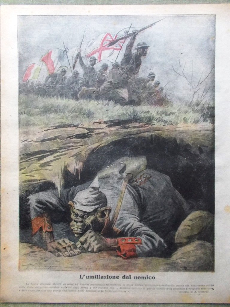 La nostra allegoria illustra un passo del discorso pronunciato recentemente da Lloyd George, precisemente anzi nelle parole che rimarranno celebri nella storia dell'azione mirabile espletata dagli Alleati e che suonano così: "Abbiamo costretto il grande esercito della Germania a rifugiarsi sotto terra, e deve essere per esso una grande umiliazione dover nascondersi in buche sotterranee" (disegno di A. Minardi)