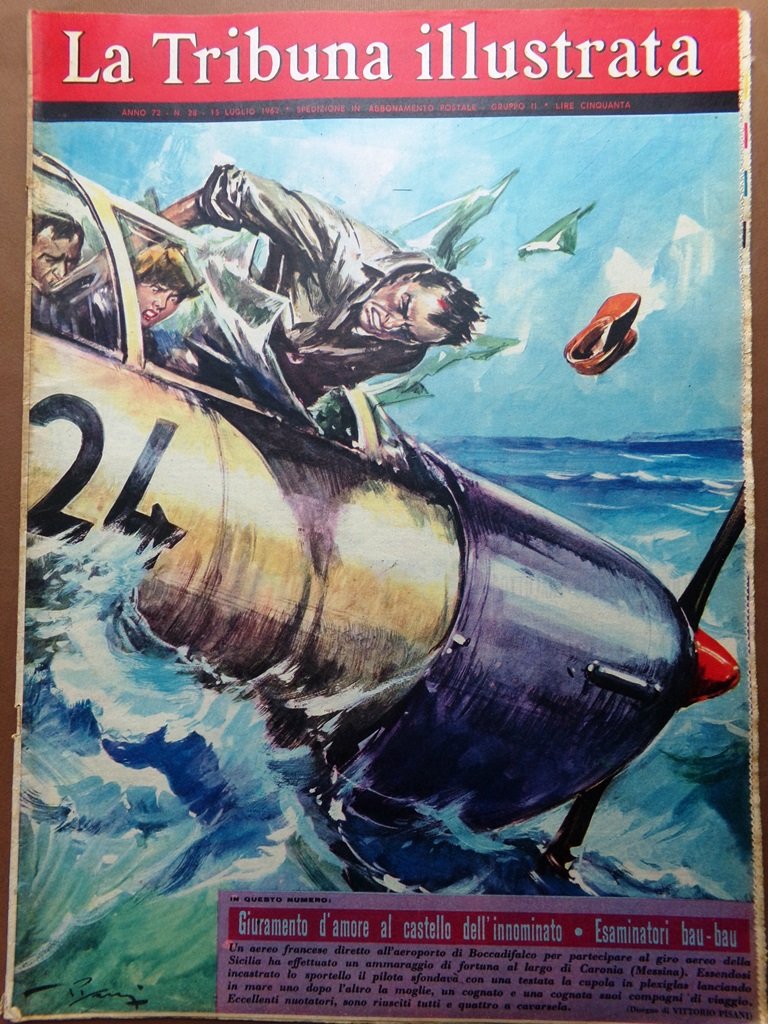 Un aereo francese diretto all'aeroporto di Boccadifalco per partecipare al giro aereo della Sicilia ha effettuato un ammaraggio di fortuna al largo di Caronia (Messina). Essendosi incastrato lo sportello il pilota sfondava con una testata la cupola in plexiglas lanciando in mare uno dopo l'altro la moglie, un cognato e una cognata suoi compagni di viaggio. Eccellenti nuotatori, sono riusciti tutti e quattro a cavarsela (disegno di Vittorio Pisani)