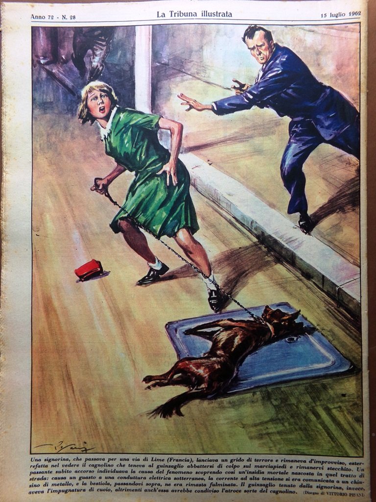 Una signorina, che passava per una via di Lime (Francia), lanciava un grido di terrore e rimaneva d'improvviso esterrefatta nel vedere il cagnolino che teneva al guinzaglio abbattersi di colpo sul marciapiedi e rimanervi stecchito. Un passante subito accorso individuava la causa del fenomeno scoprendo così un'insidia mortale nascosta in quel tratto di strada: causa un guasto a una conduttura elettrica sotterranea, la corrente ad alta tensione si era comunicata a un chiusino di metallo, e la bestiola, passandovi sopra, ne era rimasta fulminata. Il guinzaglio tenuto dalla signorina invece aveva l'impugnatura di cuoio, altrimenti anch'essa avrebbe condiviso l'atroce morte del cagnolino (disegno di Vittorio Pisani)