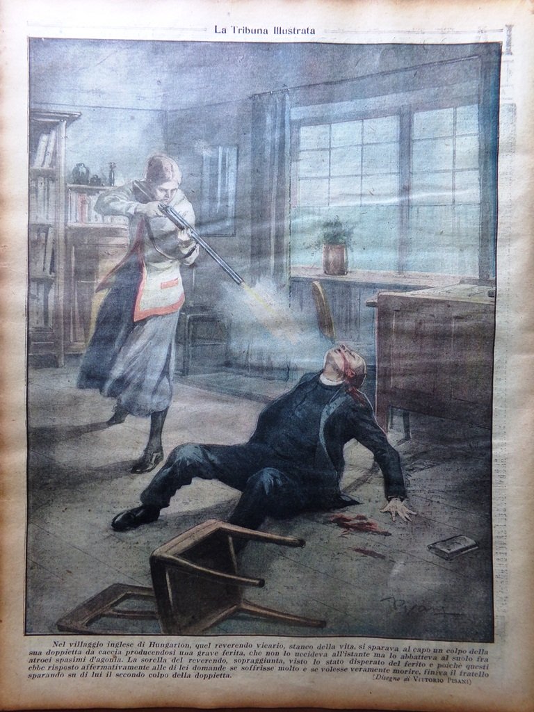 Nel villaggio inglese di Hungarton, quel reverendo vicario, stanco della vita si sparava un colpo della sua doppietta procurandosi una grave ferita che non lo uccideva all'istante. La sorella del reverendo visto lo stato disperato del ferito finiva il fratello sparando su di lui il secondo colpo della doppietta (disegno di Vittorio Pisani)