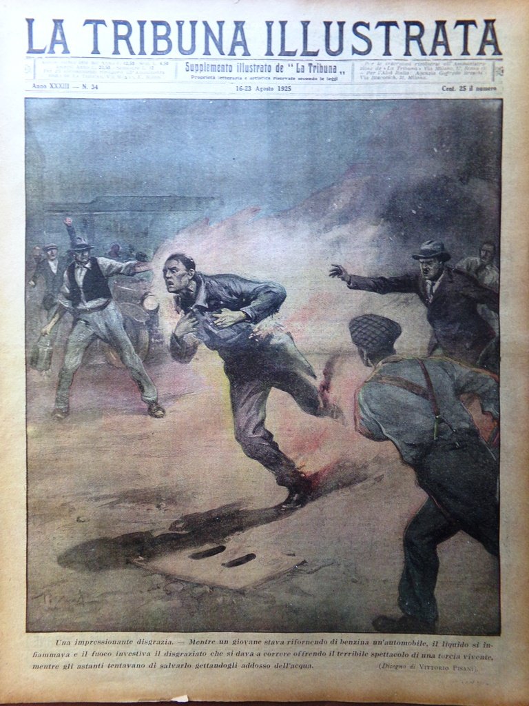 Mentre un giovane stava rifornendo di benzina un'automobile il liquido si infiammava e il fuoco investiva il disgraziato che si dava a correre mentre gli astanti tentavano di salvarlo (disegno di Vittorio Pisani)