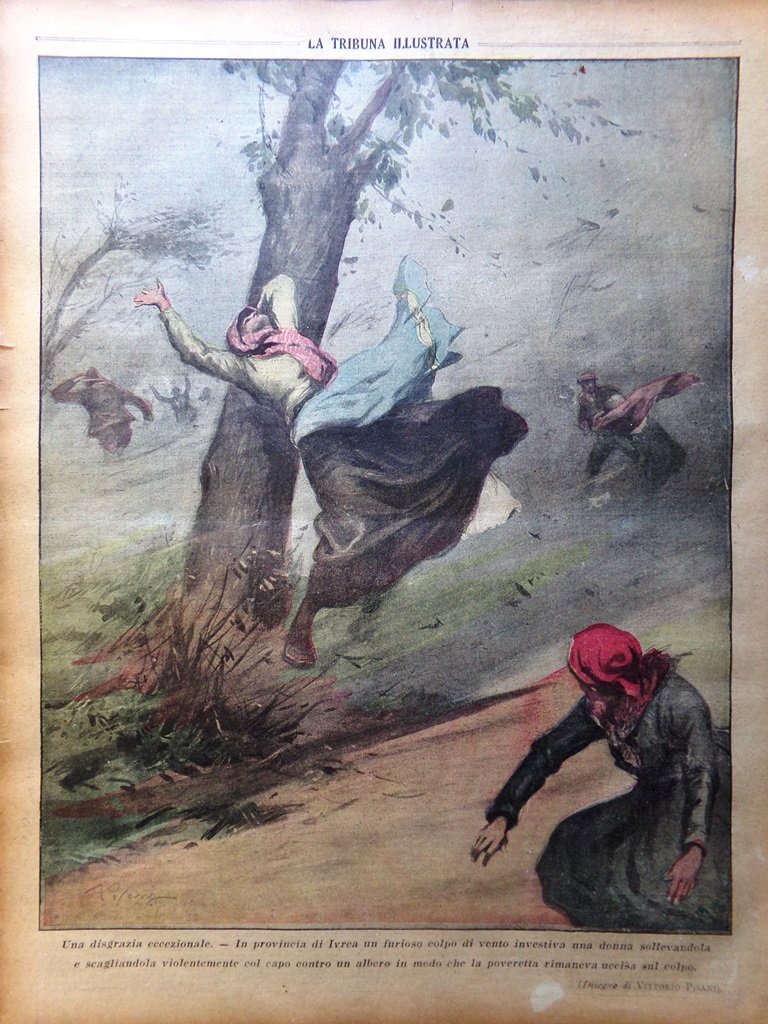 In provincia di Ivrea un furioso colpo di vento investiva una donna sollevandola e scagliandola contro un albero uccidendola sul colpo (disegno di Vittorio Pisani)