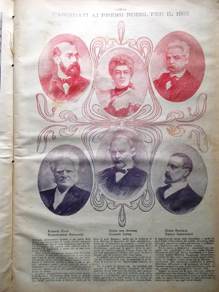 Candidati ai premi Nobel per il 1902: Robert Koch, Bjørnstjerne Bjørnson, Bertha von Suttner, Joseph Lister, Guido Baccelli, Henryk Sienkiewicz