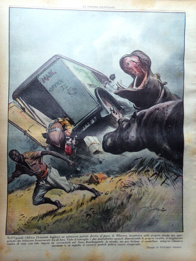 Nell'Uganda (Africa Orientale Inglese) un autocarro postale diretto al paese di Mbarara incontrava sulla propria strada due ippopotami che lottavano ferocemente fra di loro. Visto il convoglio i due mastodontici animali, dimenticando la propria rivalità, si scagliavano contro di esso con tale impeto da rovesciarlo nel fosso fiancheggiante la strada, ma per fortuna il conduttore indigeno rimaneva incolume e, in seguito, il corriere postale poteva essere ricuperato (disegno di Vittorio Pisani)