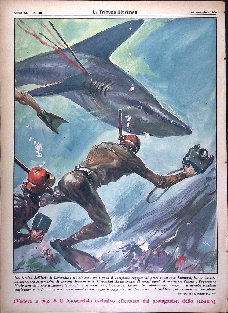 Nei fondali dell'isola di Lampedusa tre cineasti tra i quali il campione europeo di pesca subacquea Jannuzzi, hanno vissuto un'avventura sottomarina di estrema drammaticità. Circondati da un branco di voraci squali, il regista De Sanctis e l'operatore Merlo non esitavano a puntare le macchine da presa verso i pescicani. La lotta immediatamente ingaggiata si sarebbe conclusa tragicamente se Jannuzzi non avesse salvato i compagni trafiggendo con due arpioni l'assalitore più accanito e pericoloso (disegno di Vittorio Pisani)