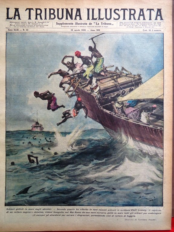 Schiavi gettati in mare dagli abissini. Secondo quanto ha riferito in suoi recenti articoli lo scrittore Emil Ludwig, il capitano di un veliero negriero abissino, vistosi inseguito nel Mar Rosso da una nave europera, gettò in mare tutti gli schiavi per costringere gli europei ad attardarsi per salvare i disgraziati, permettendo così al veliero di fuggire (disegno di Vittorio Pisani)