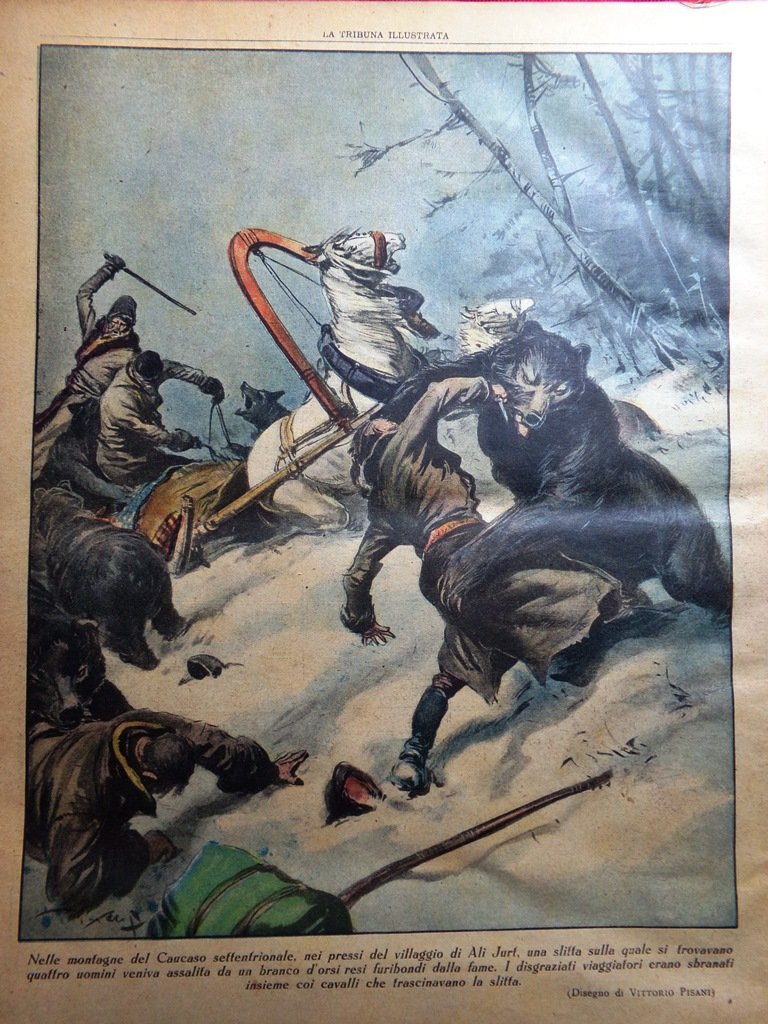 Nelle montagne del Caucaso settentrionale nei pressi del villaggio di Alì Jurf, una slitta sulla quale si trovavano quattro uomini, veniva assalita da un branco d'orsi resi furibondi dalla fame. I disgraziati viaggiatori erano sbranati insieme coi cavalli che trascinavano la slitta (disegno di Vittorio Pisani)