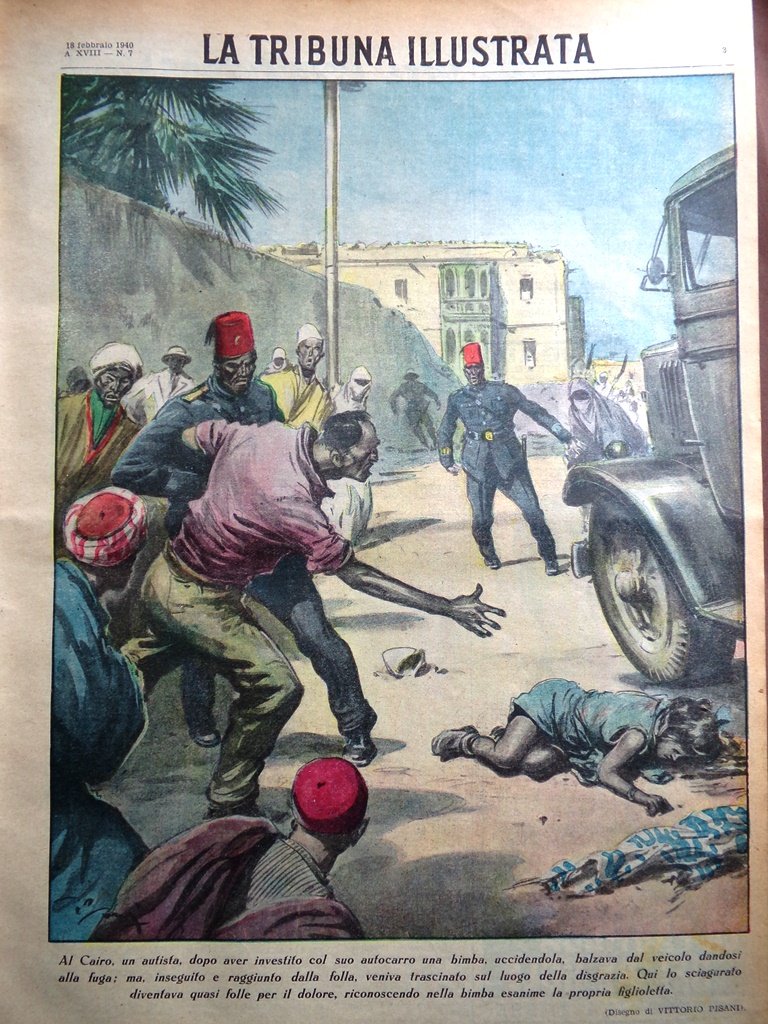 Al Cairo, un autista, dopo aver investito con il suo autocarro una bimba, uccidendola, balzava dal veicolo dandosi alla fuga: ma inseguito e raggiunto dalla folla veniva trascinato sul luogo della disgrazia. Qui diventava quasi folle per il dolore, riconoscendo nella bimba esanime la propria figlioletta (disegno di Vittorio Pisani)