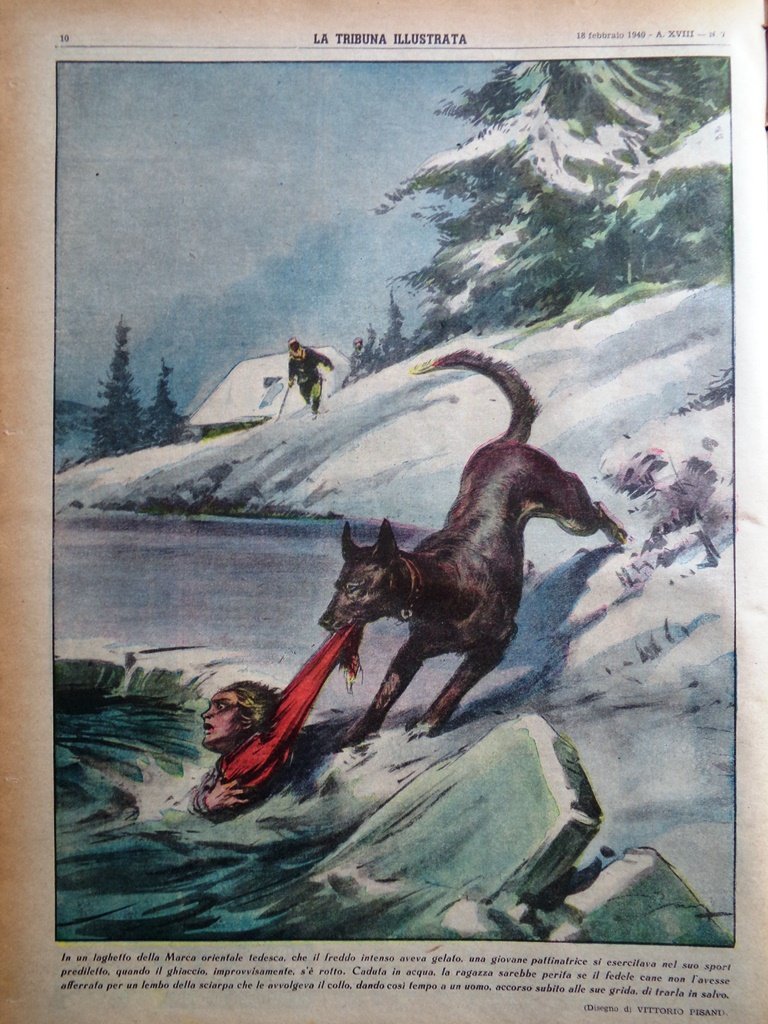 In un laghetto della Marca orientale tedesca, che il freddo intenso aveva gelato, una giovane pattinatrice si esercitava nel suo sport prediletto quando il ghiaccio s'è rotto. Sarebbe perita se il fedele cane non l'avesse afferrata per un lembo della sciarpa che le avvolgeva il collo (disegno di Vittorio Pisani)
