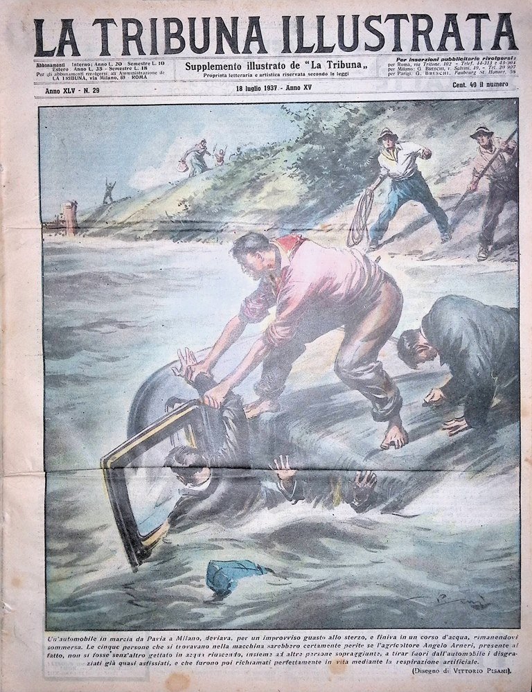 Un'automobile in marcia da Pavia e Milano, deviava, per un improvviso guasto allo sterzo, e finiva in un corso d'acqua, rimanendovi sommersa. Le cinque persone che si trovavano nella macchina sarebbero certamente perite se l'agricoltore Angelo Arneri, presente al fatto, non si fosse senz'altro gettato in acqua riuscendo, insieme ad altre persone sopraggiunte, a tirar fuori dall'automobile i disgraziati già quasi asfissiati, e che furono poi richiamati perfettamente in vita mediante la respirazione artificiale (disegno di Vittorio Pisani)
