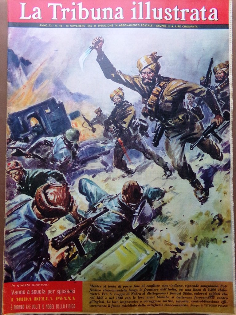 Mentre si tenta di porre fine al conflitto cino-indiano, riprende sanguinosa l'offensiva cinocomunista lungo le frontiere dell'India, su una linea di 3200 chilometri. Fra le truppe di Nehru si distinguono i famosi Sikhs, valorosi soldati che nel 1845 e nel 1848 con le loro armi bianche si batterono ferocemente contro gli inglesi (disegno di Vittorio Pisani)