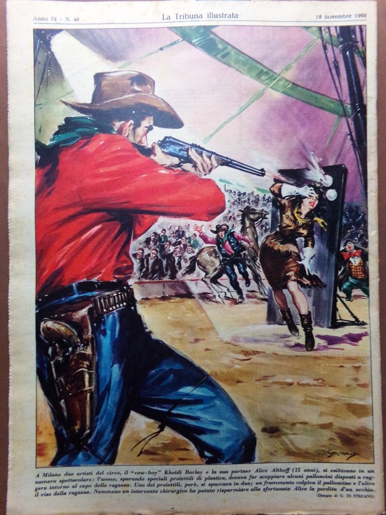 A Milano due artisti del circo, il cowboy Khoidi Barlay e la sua partner Alice Althoff (15 anni), si esibivano in un numero spettacolare: l'uomo sparando speciali proiettili di plastica doveva far scoppiare alcuni palloncini disposti a raggera intorno al capo della ragazza. Uno dei proiettili però si spaccava in due; un frammento colpiva il palloncino e l'altro il viso della ragazza. Nemmeno un intervento chirurgico ha potuto risparmiare alla sfortunata Alice la perdita di un occhio (disegno di Giovanni Di Stefano)