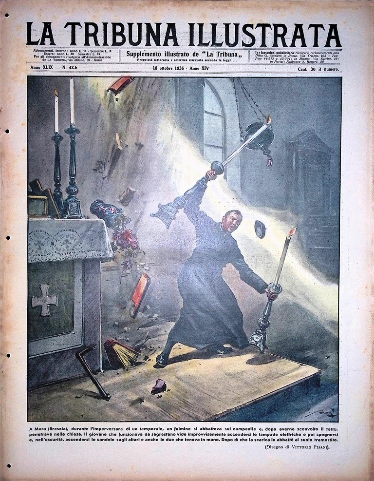 A Mura (Brescia), durante l'imperversaredi un temporale, un fulmine si abbatteva sul campanile e, dopo averne sconvolto il tetto, penetrava nella chiesa. Il giovane che funzionava da sagrestano vide improvvisamente accendersi le lampade elettriche e poi spegnersi e, nell'oscurità, accendersi le candele sull'altare e anche le due che teneva in mano. Dopo di che la scarica lo abbattè al suolo tramortito (disegno di Vittorio Pisani)