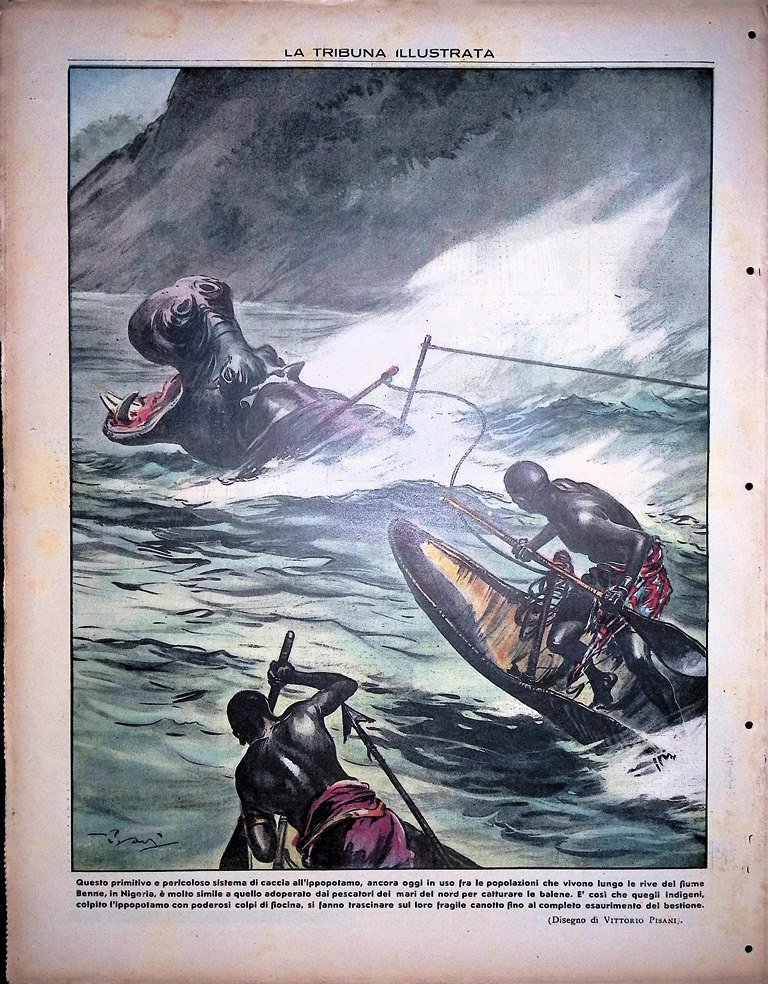 Questo primitivo e pericoloso sistema di caccia all'ippopotamo, ancora oggi in uso fra le popolazioni che vivono lungo le rive del fiume Benne in Nigeria è molto simile a quello adoperato dai pescatori dei mari del nord per catturare le balene. È così che quegli indigeni colpito l'ippopotamo con poderosi colpi di fiocina, si fanno trascinare sul loro fragile canotto fino al completo esaurimento del bestione (disegno di Vittorio Pisani)