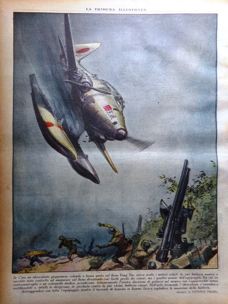 In Cina, un idrovolante giapponese, volando a bassa quota sul fiume Yang Tse, aveva avuto i motori colpiti da una batteria nemica e sarebbe stato costretto ad ammarare sul fiume diventando così facile preda dei cinesi: ma i quattro uomini dell'equipaggio, fra cui un contrammiraglio e un colonnello medico, prendevano fulmineamente l'eroica decisione di gettarsi sul nemico con l'apparecchio ormai inutilizzabile e, infatti, lo dirigevano in picchiata contro la più vicina batteria cinese. Nell'urto tremendo l'idrovolante s'incendiava distruggendosi con tutto l'equipaggio, mentre il torrente di benzina in fiamme faceva esplodere le munizioni della batteria (disegno di Vittorio Pisani)