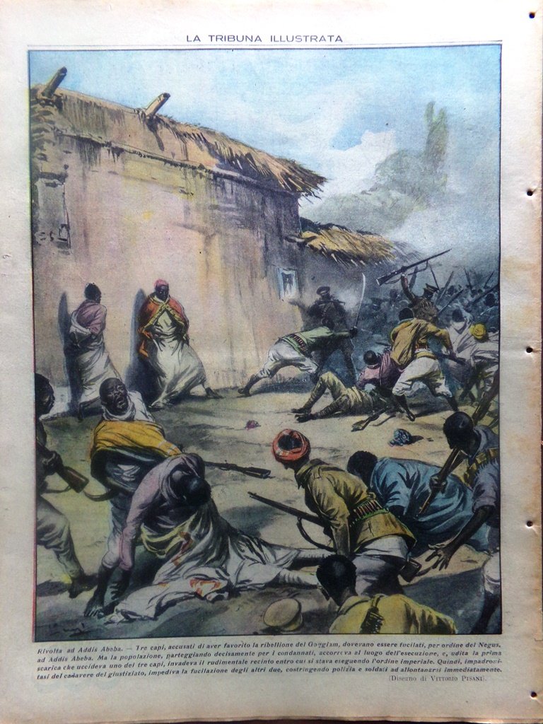 Tre capi, accusati di aver favorito la ribellione del Goggiam, dovevano essere fucilati per ordine del Negus ad Addis Abeba. Ma la popolazione irrompeva subito dopo la fucilazione del primo, impedendo la fucilazione degli altri due (disegno di Vittorio Pisani)