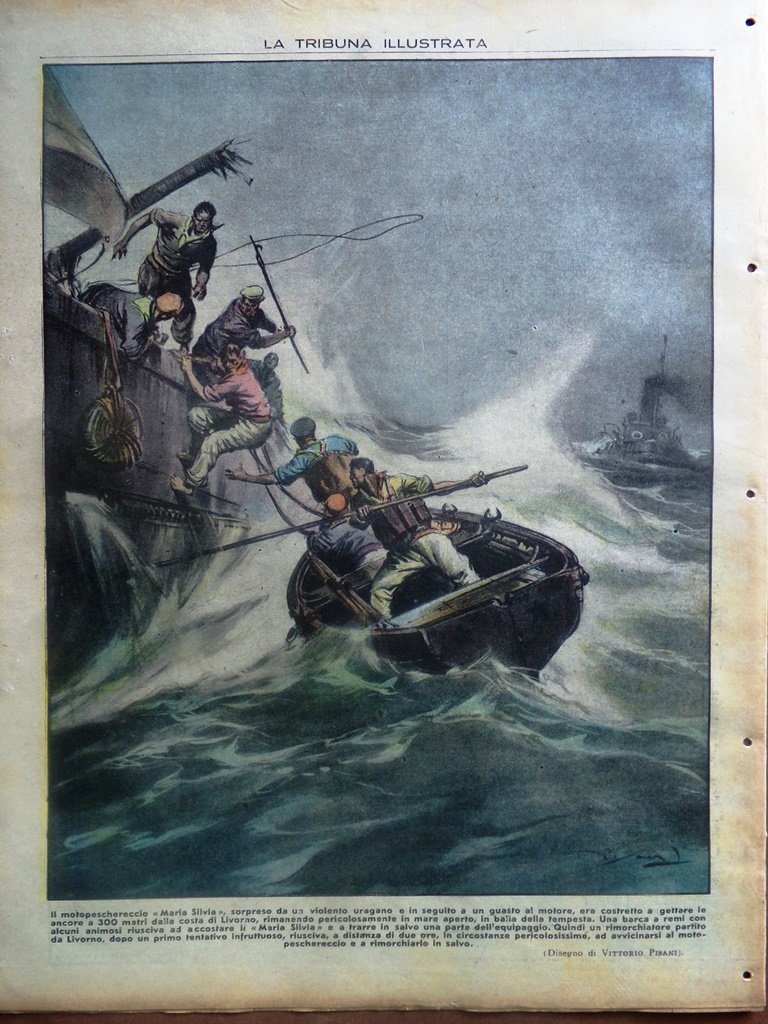 Il motopeschereccio "Maria Silvia" sorpreso da un violento uragano era costretto a gettare le ancore a 300 metri dalla costa di Livorno. Una barca a remi riusciva a raggiungerlo e trarre in salvo una parte dell'equipaggio, quindi un rimorchiatore dopo due ore raggiungeva il peschereccio e lo rimorchiava a riva (disegno di Vittorio Pisani)