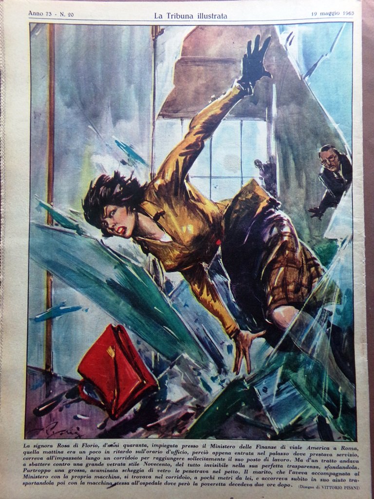 La signora Rosa di Florio, di anni 40, impiegata presso il Ministero delle Finanze di viale America a Roma, quella mattina era un poco in ritardo sull'orario d'ufficio, perciò appena entrata nel palazzo dove prestava servizio, correva all'impazzata lungo un corridoio per raggiungere sollecitamente il suo posto di lavoro. Ma d'un tratto andava a sbattere contro una grande vetrata stile Novecento, del tutto invisibile nella sua perfetta trasparenza, sfondandola. Purtroppo una grossa acuminata scheggia di vetro le penetrava nel petto. Il marito che l'aveva accompagnata al Ministero con la propria macchina, si trovava nel corridoio a pochi metri da lei, e accorreva subito in suo aiuto trasportandola poi con la macchina stessa all'ospedale dover però la poveretta decedeva due ore dopo (disegno di Vittorio Pisani)
