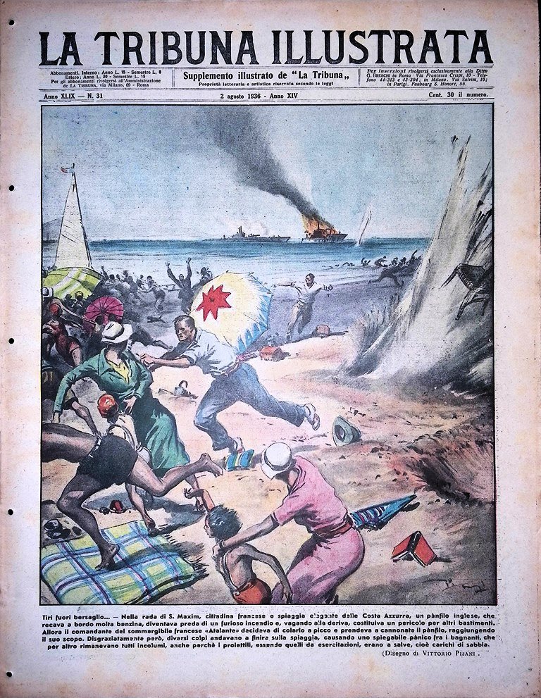 Nella rada di S. Maxim, cittadina francese e spiaggia della Costa Azzurra, un panfilo inglese si incendiava e andando alla deriva costituiva un pericolo per altri bastimenti. Allora il comandante del sommergibile francese "Atalanta" decideva di colarlo a picco e lo prendeva a cannonate. Alcuni colpi però finivano sulla spiaggia creando panico fra i bagnanti, incolumi perché i proiettili erano a salve (disegno di Vittorio Pisani)