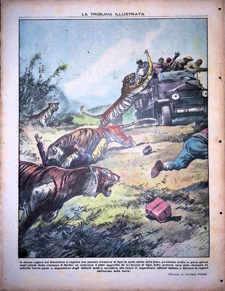In alcune regioni del Manciukuò si registra una paurosa invasione di tigri che, spinte dalla fame, penetrano anche in pieno giorno negli abitati. Un autocarro è stato aggredito e sette persone sono state sbranate. Le autorità hanno messo a disposizione degli abitanti fucili e munizioni per difendersi (disegno di Vittorio Pisani)