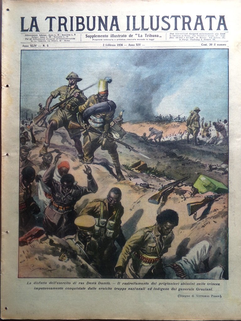 La disfatta dell'esercito di ras Destà Damtò. Il rastrellamento dei prigionieri abissini nelle trincee conquistate dalle eroiche truppe nazionali ed indigene del generale Graziani (disegno di Vittorio Pisani)