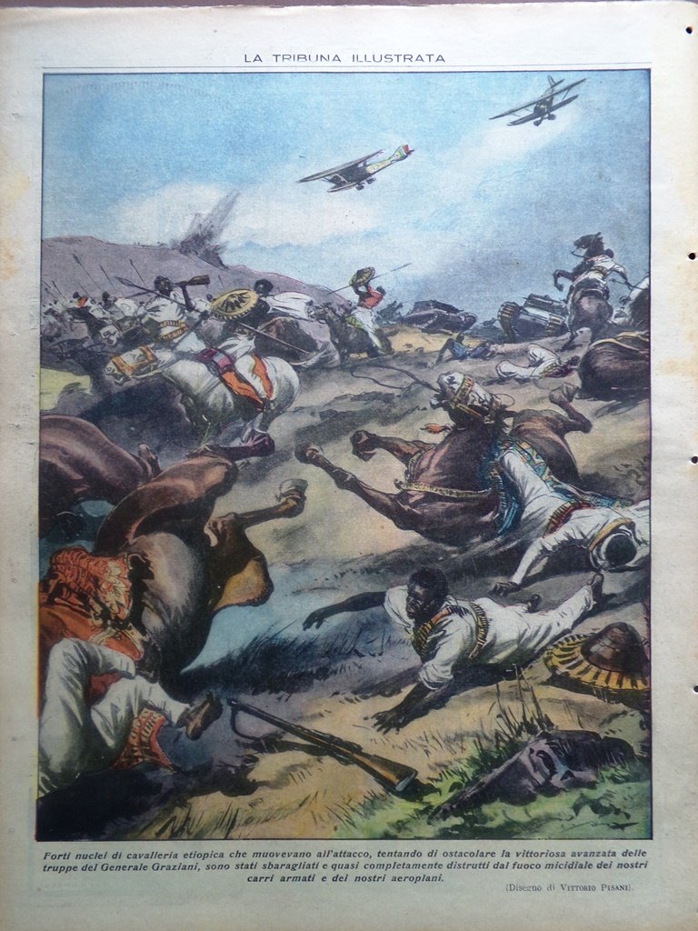Forti nuclei di cavalleria etiopica che muovevano all'attacco, tentando di ostacolare la vittoriosa avanzata delle truppe del Generale Graziani sono stati sbaragliati e quasi completamente distrutti dal fuoco micidiale dei nostri carri armati e dei nostri aeroplani (disegno di Vittorio Pisani)