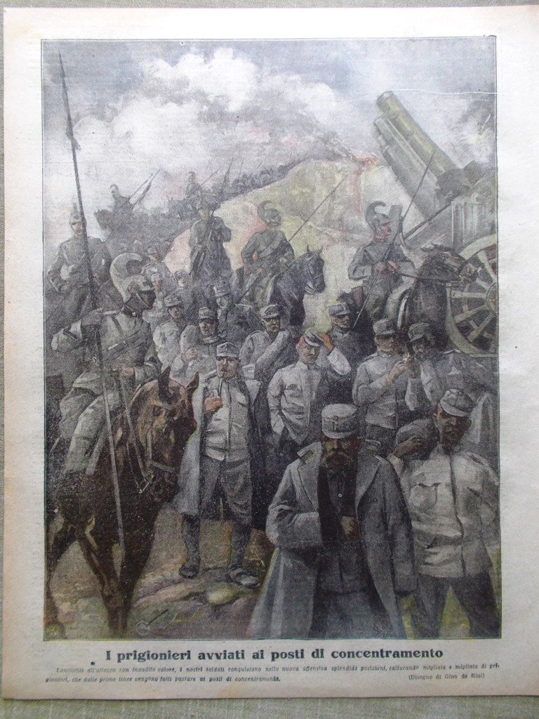 Lanciatisi all'attacco con inaudito valore, i nostri soldati conquistano nella nuova offensiva splendide posizioni, catturando migliaia di prigionieri che vengono poi fatti passare ai posti di concentramento (disegno di Gino De Bini)