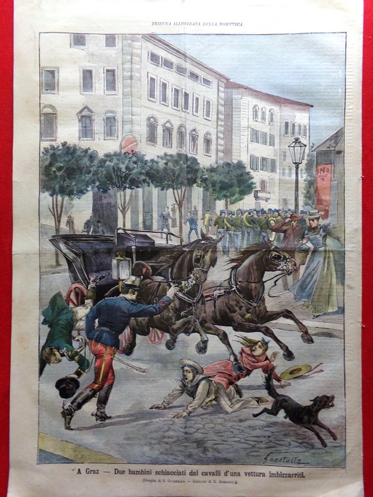 A Graz: due bambini schiacciati dai cavalli di una vettura imbizzarriti (disegno di S. Guastalla)