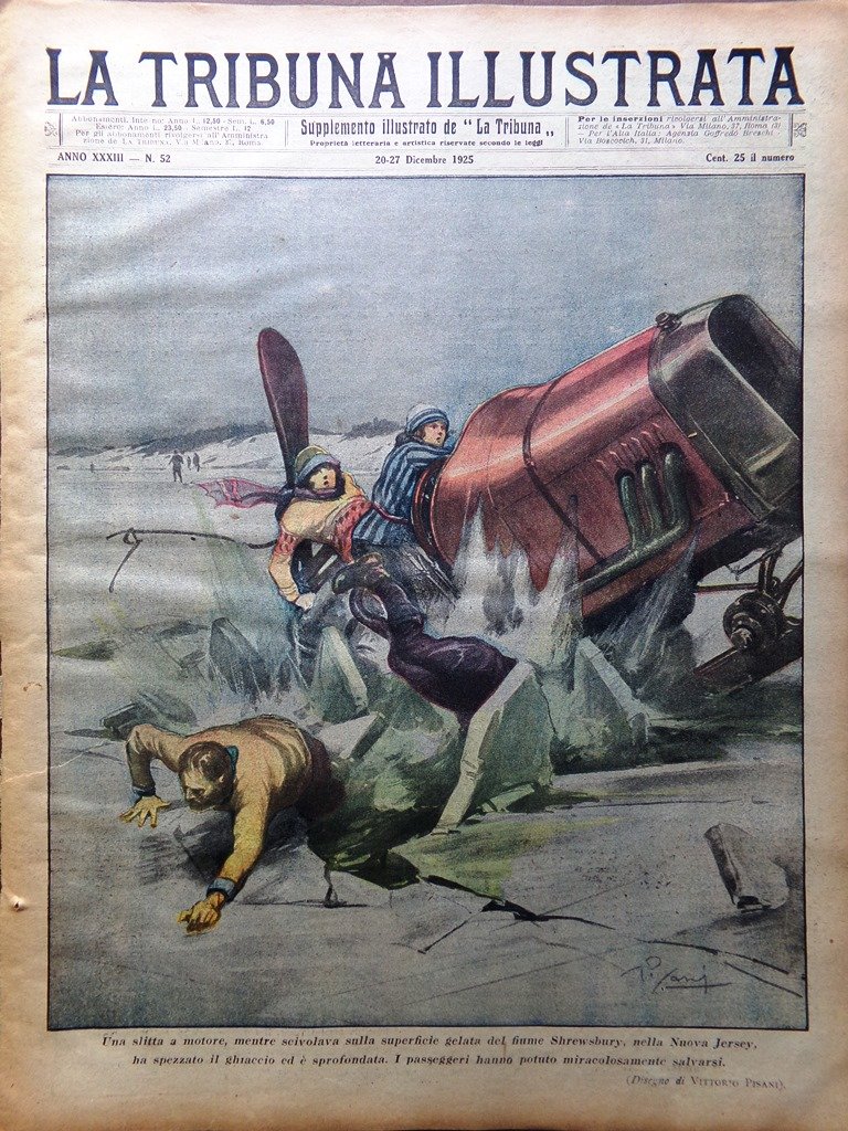Una slitta a motore, mentre scivolava sulla superficie gelata del fiume Shrewsbury nel New Jersey, ha spezzato il ghiaccio ed è sprofondata. I passeggeri salvi per miracolo (disegno di Vittorio Pisani)
