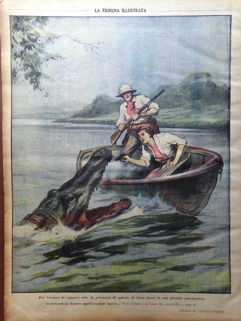 Per fortuna la signora ebbe la presenza di spirito di tirar fuori la sua pistola automatica scaricandola dentro quell'orribile bocca (disegno di Vittorio Pisani)