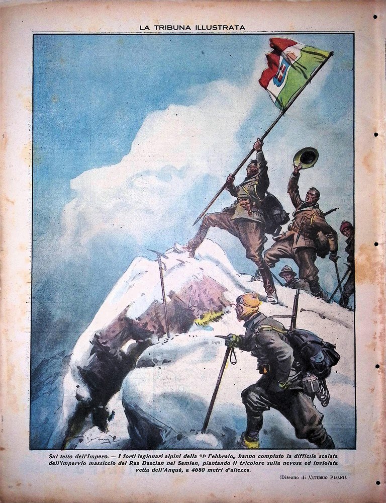 I forti legionari alpini della "1° febbraio" hanno compiuto la difficile scalata dell'impervio massiccio del Ras Dascian nel Semien, piantando il tricolore sulla nevosa e inviolata vetta dell'Anquà, a 4680 metri d'altezza (disegno di Vittorio Pisani)
