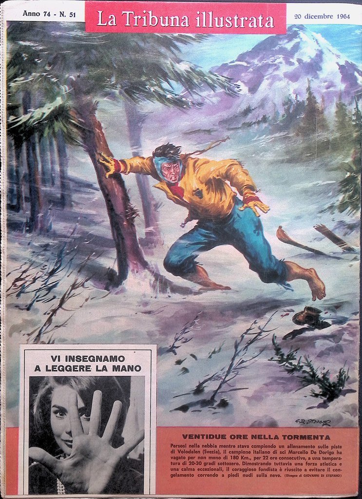 Percorsi nella nebbia mentre stava compiendo un allenamento sulle piste di Volodalen (Svezia), il campione italiano di sci Marcello De Dorigo ha vagato per non meno di 180 Km., per 22 ore consecutive, a una temperatura di 20-30 gradi sottozero. Dimostrando tuttavia una forza atletica e una calma eccezionali, il coraggioso fondista è riuscito a evitare il congelamento correndo a piedi nudi sulla neve.