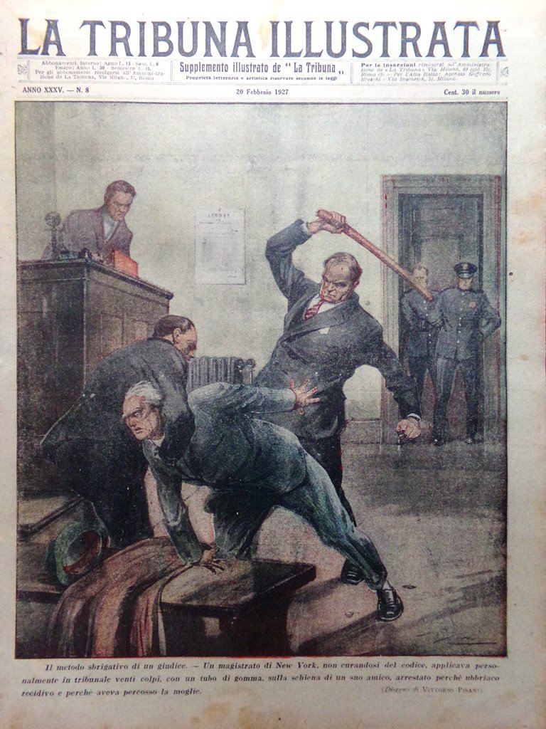 Il metodo sbrigativo di un giudice. Un magistrato di New York, non curandosi del codice, applicava in tribunale 20 colpi con un tubo di gomma sulla schiena di un suo amico arrestato perché ubriaco, recidivo e aveva percosso la moglie (disegno di Vittorio Pisani)