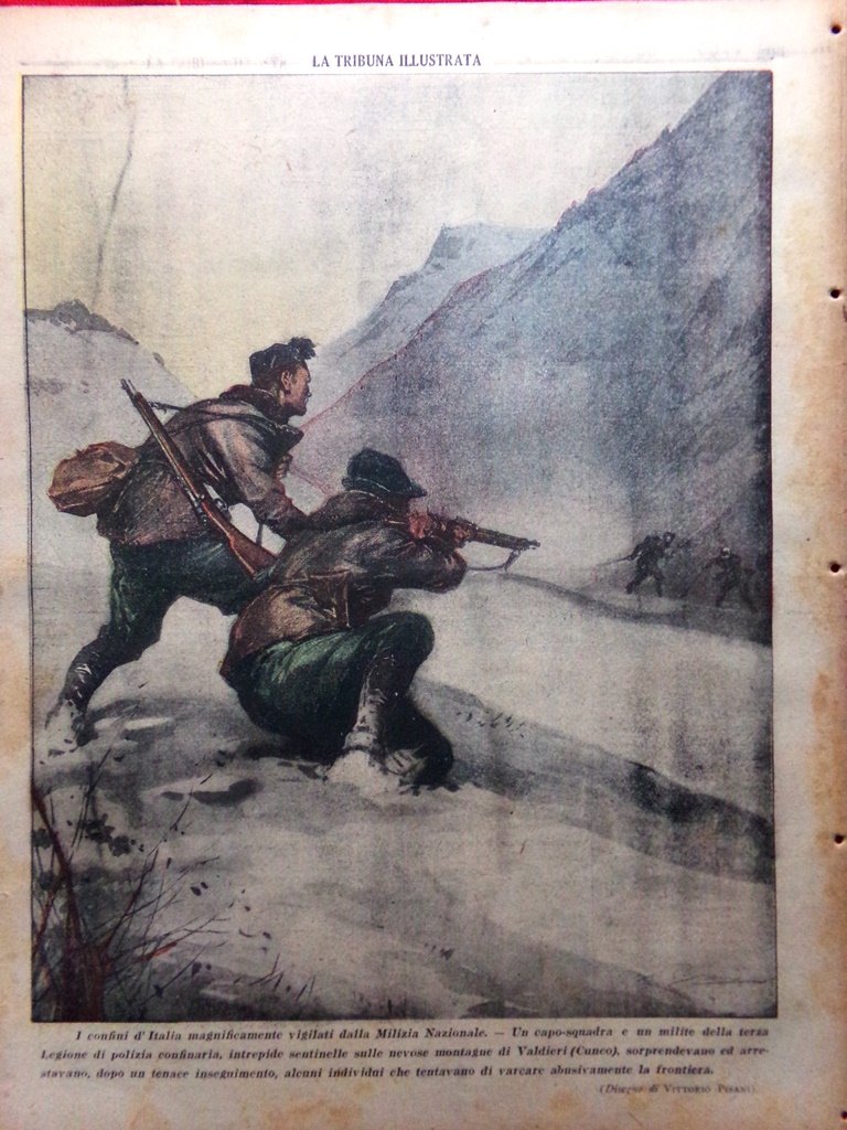 I confini d'Italia vigilati dalla Milizia Nazionale. Un capo-squadra e un milite della terza Legione di polizia confinaria, sentinelle sulle nevose montagne di Valdieri (Cuneo) sorprendevano e arrestavano dopo un tenace inseguimento alcuni individui che cercavano di varcare la frontiera (disegno di Vittorio Pisani)