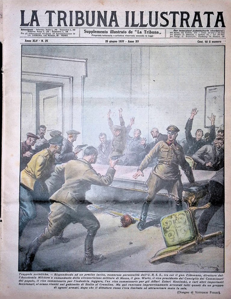 Rispondendo ad un preciso invito, numerose personalità dell'URSS, tra cui il gen. Eidemann, direttore dell'accademia militare e comandante della circoscrizione militare di Mosca, il gen. Wortz, il vice presidente del consiglio dei commissari del popolo, il vice commissario per l'industria leggera, l'ex vice commissario per gli Affari Esteri Kestinski, e vari altri importanti funzionari, si erano riuniti nel gabinetto di Stalin al Cremlino. Ma qui venivano improvvisamente arrestati tutti quanti da un gruppo di agenti armati, dopo che il dittatore rosso s'era limitato ad attraversare muto la sala (disegno di Vittorio Pisani)