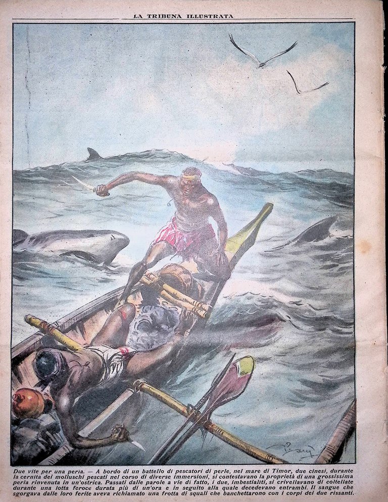 A bordo di un battello di pescatori di perle, nel mare di Timor, due cinesi, durante la cernita dei molluschi pescati nel corso di diverse immersioni, si contestavano la proprietà di una grossissima perla rinvenuta in un'ostrica. Passati dalle parole a vie di fatto, i due, imbestialiti, si crivellavano di coltellate durante una lotta feroce durata più di un'ora e in seguito alla quale decedevano entrambi. Il sangue che sgorgava dalle loro ferite aveva richiamato una frotta di squali che banchettarono con i corpi dei due rissanti (disegno di Vittorio Pisani)