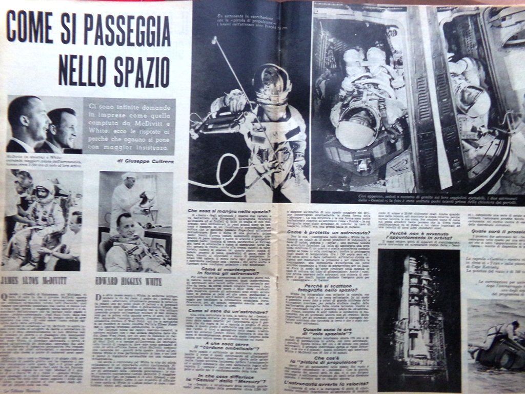 Spinto dai getti della sua "pistola di propulsione", l'astronauta Edward H. White è stato il primo uomo a muoversi in qualsiasi direzione nello spazio, dopo essere uscito dalla capsula "Gemini". White avrebbe dovuto avvicinarsi all'ultimo stadio del razzo vettore, ma le violente oscillazioni del missile e la scarsità del carburante a disposizione hanno consigliato di non effettuare l'esperimento (disegno di Giovanni Di Stefano)