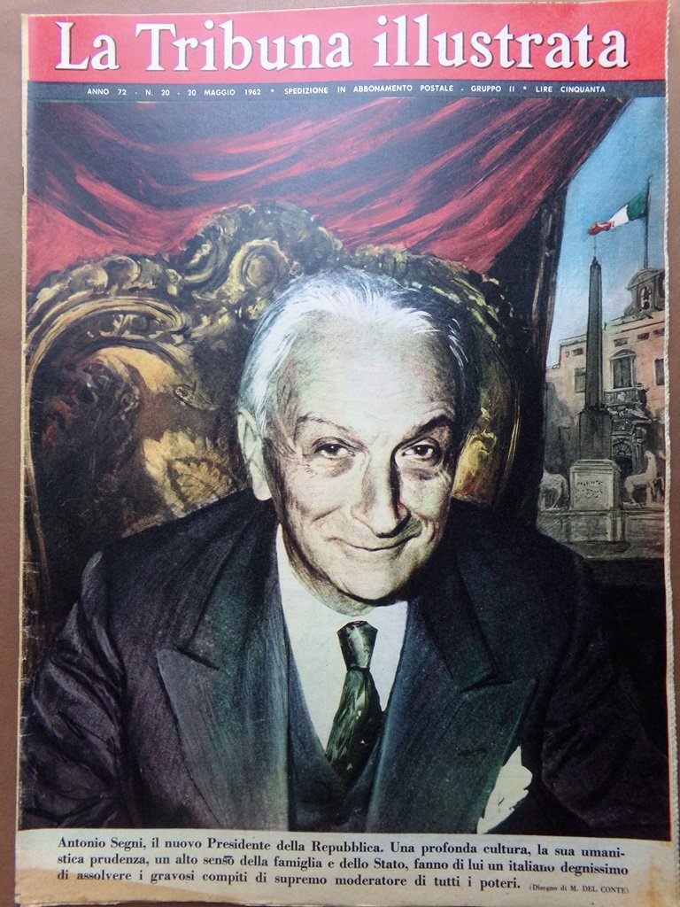 Antonio Segni, il nuovo Presidente della Repubblica. Una profonda cultura, la sua umanistica prudenza, un alto senso della famiglia e dello Stato, fanno di lui un italiano degnissimo di assolvere i gravosi compiti di supremo moderatore di tutti i poveri (disegno di M. Del Conte)